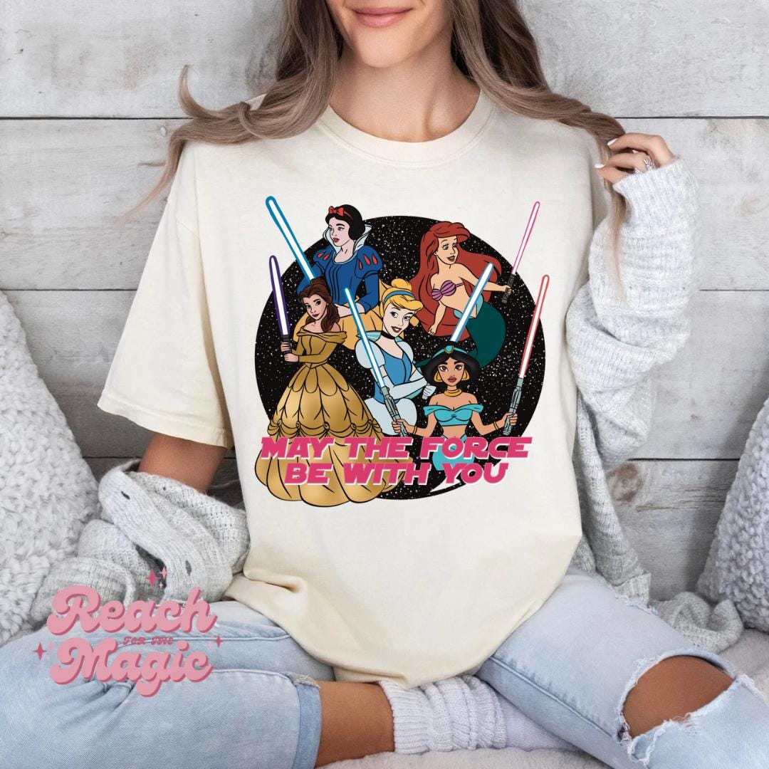 Celebrate Star Wars Day like royalty with this one-of-a-kind Disney Princess Jedi mashup tee! Featuring your favorite princesses wielding lightsabers, this shirt is perfect for fans of both magical kingdoms and galaxies far, far away.