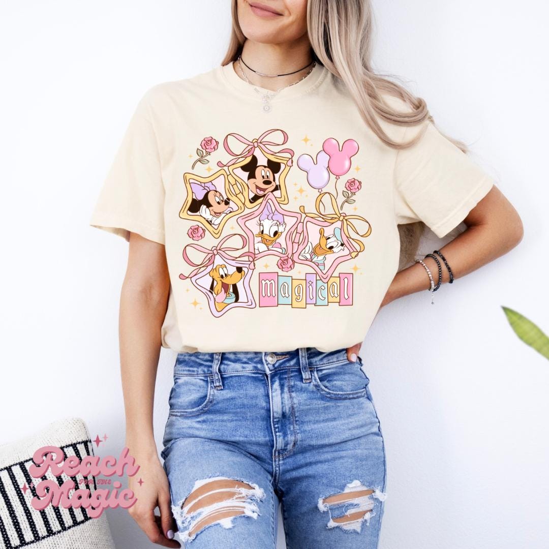 This Magical Disney Character Shirt features Minnie, Mickey, Daisy, and Pluto in a sweet pastel star design—perfect for Disney trips, park outfits, or everyday wear.
