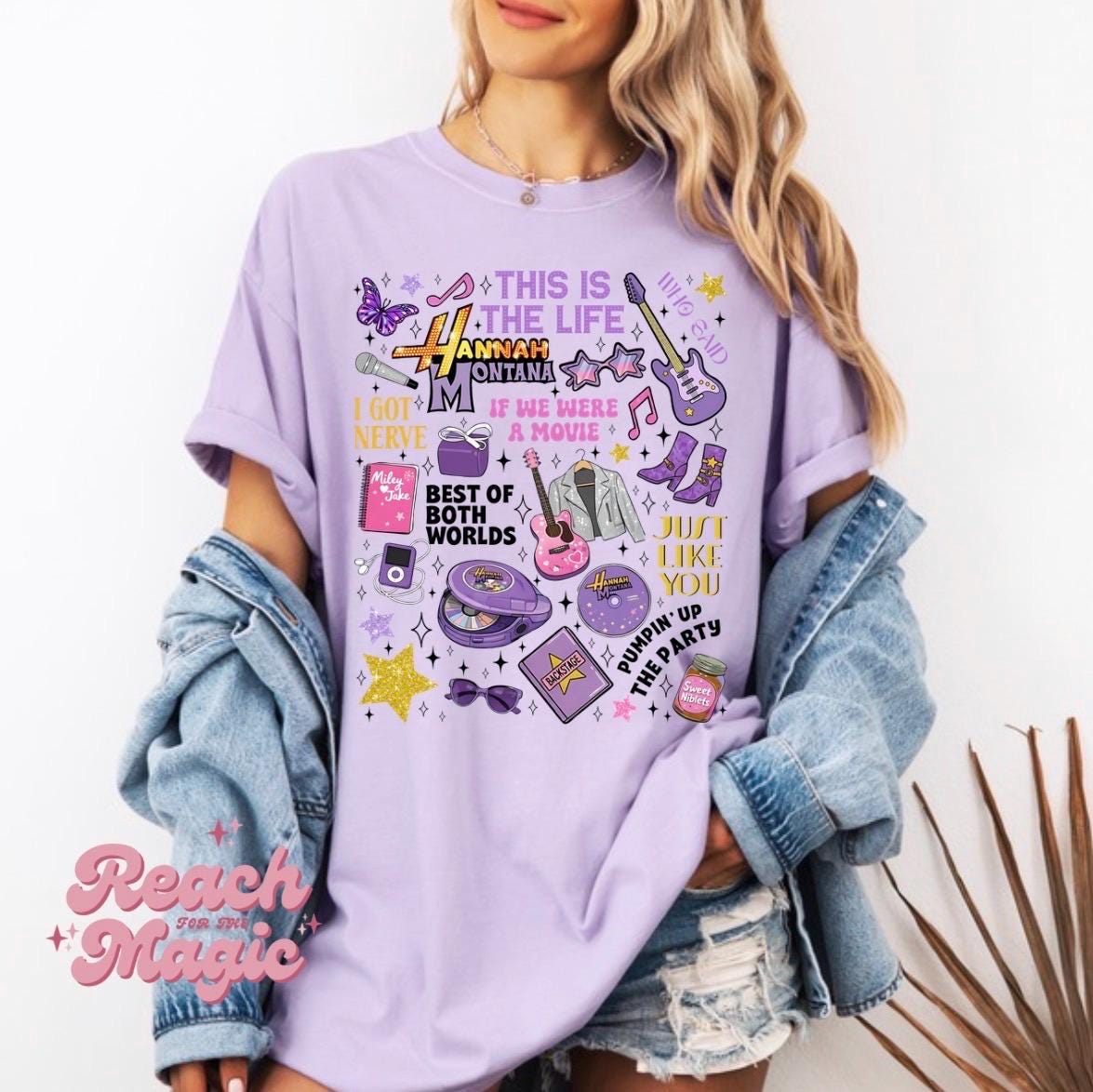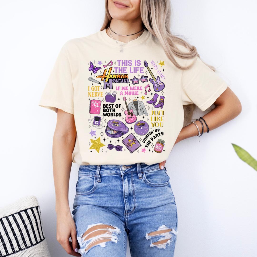 Step into your main character era with this iconic Hannah Montana inspired graphic tee 💜 Featuring a bold, eye-catching design that channels ultimate pop star energy, this shirt is perfect for anyone who still believes in living the best of both worlds.